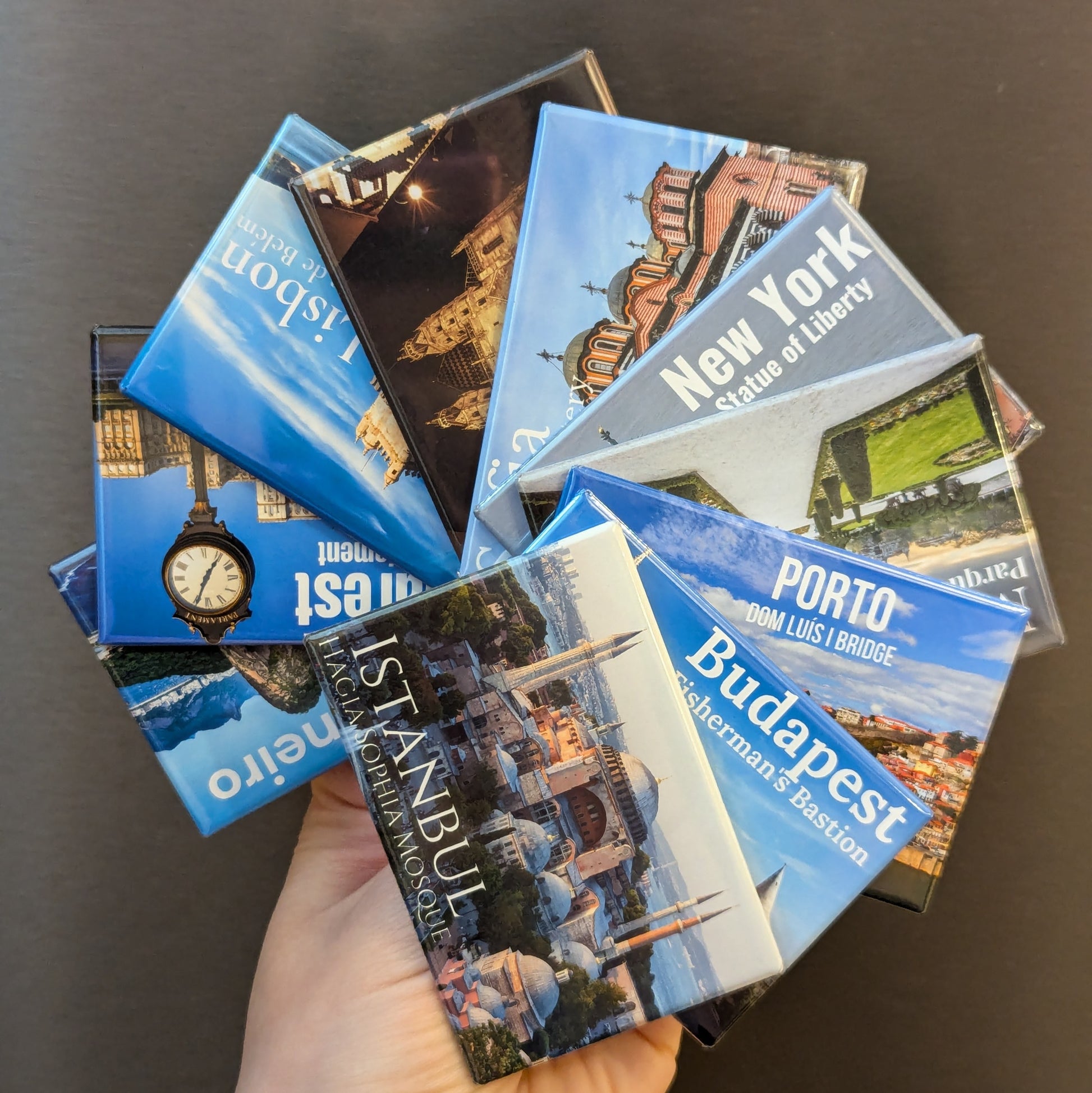 Ovi prilagođeni magneti za hladnjak s motivima putovanja personalizirani su suveniri s prepoznatljivim znamenitostima, poznatim gradovima i prekrasnim prirodnim mjestima iz cijelog svijeta.