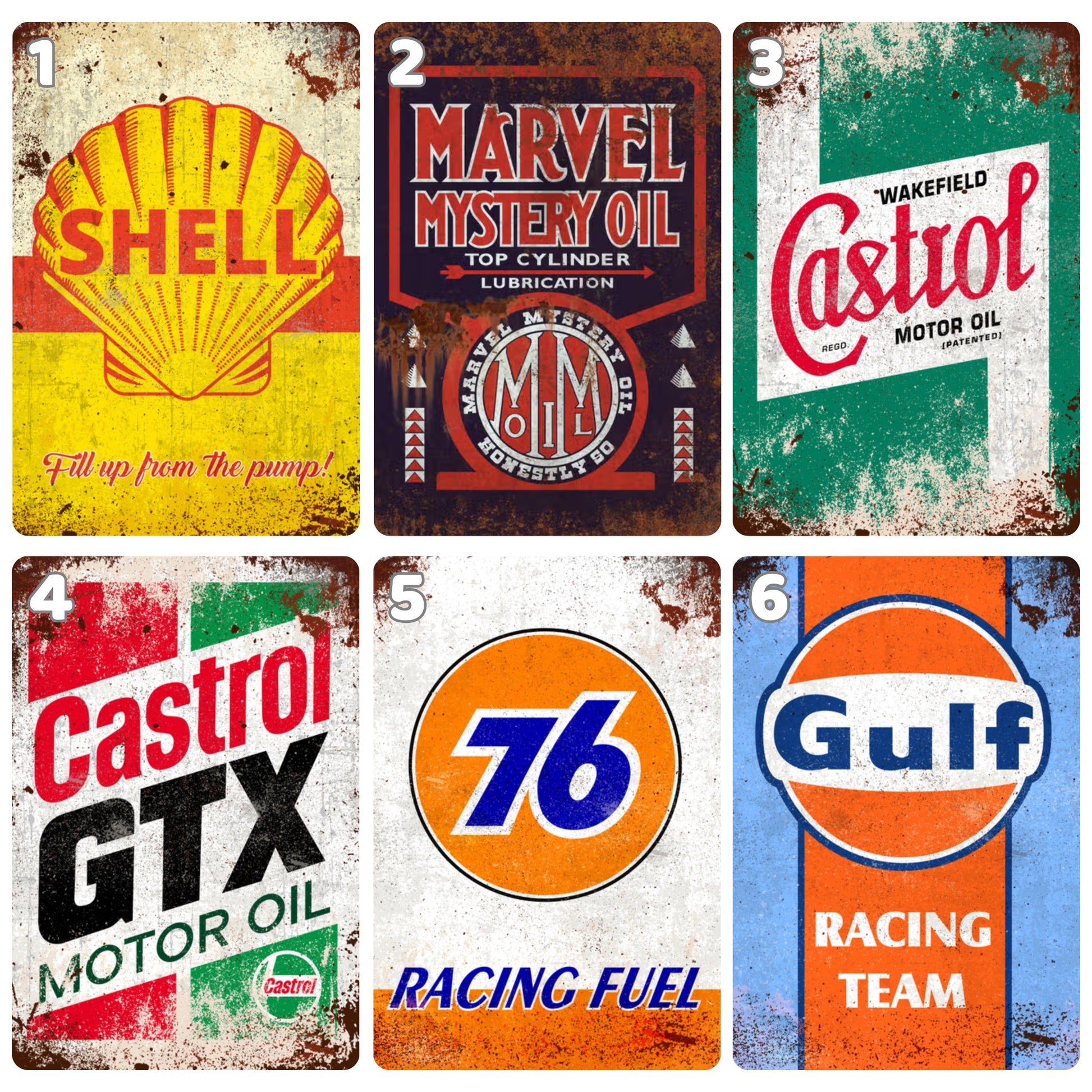 Ovi retro magneti za hladnjak s motornim uljem i gorivom nadahnuti su klasičnim automobilskim oglašavanjem i trkaćom kulturom sredine stoljeća.